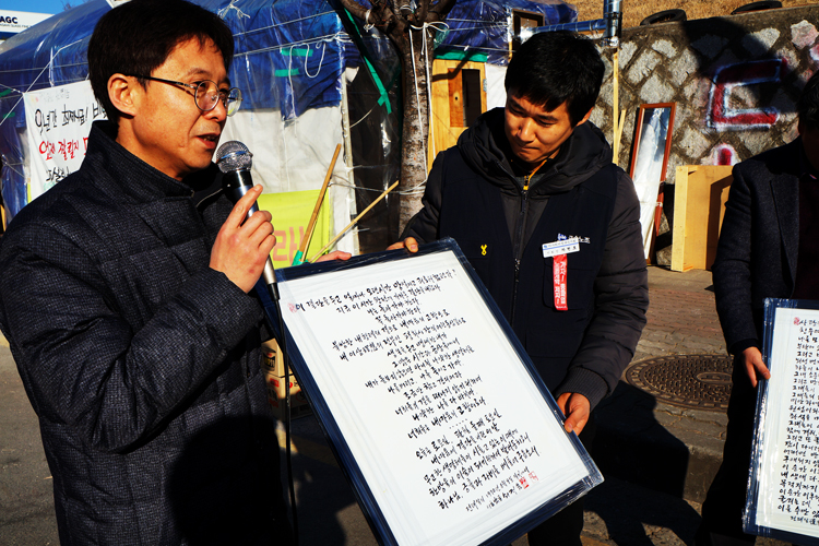 12일 대구, 구미 시민사회단체가 비정규직 해고 투쟁 200일을 앞둔 아사히글라스 농성장에 방문해 노조(금속노조 아사히비정규직지회)에 연대기금 ...