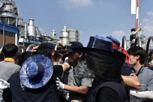 한국타이어 올해 임금 및 단체협약 체결을 위한 노사 교섭이 난항을 겪는 가운데 금속노조 한국타이어지회가 항의 집회를 열었지만 사측이 막아 물리적...