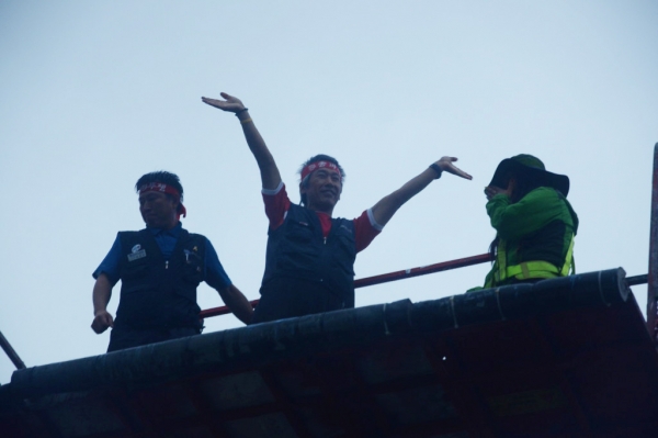 공공운수노조 화물연대울산지부 CJ대한통운 택배분회 백상식(43) 분회장과 배찬민(47) 조직담당자가 13일 새벽 3시 서울 여의도에 있는 광고탑...