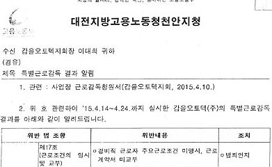 고용노동부는 갑을오토텍 특별근로감독 일부 결과, 근로기준법과 산업안전보건법 등 다수의 법 위반 사항을 적발했다고 밝혔다.