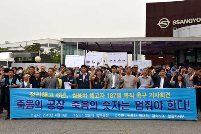 노조 쌍용차지부(지부장 김득중)가 6월8일 오전 평택 쌍용차공장 정문 앞에서 ‘정리해고 6주년 사회 각계각층 기자회견’을 진행했다. 6월8일은 ...
