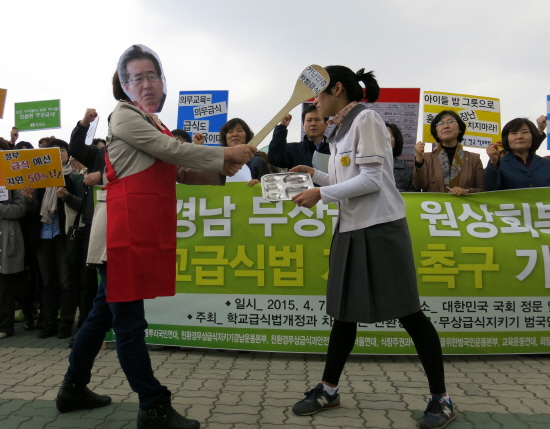 경남 무상급식 중단으로 촉발된 홍준표 경남도지사 규탄의 목소리가 학교급식법 개정을 통한 의무급식 안정화 요구로 확대되고 있다.