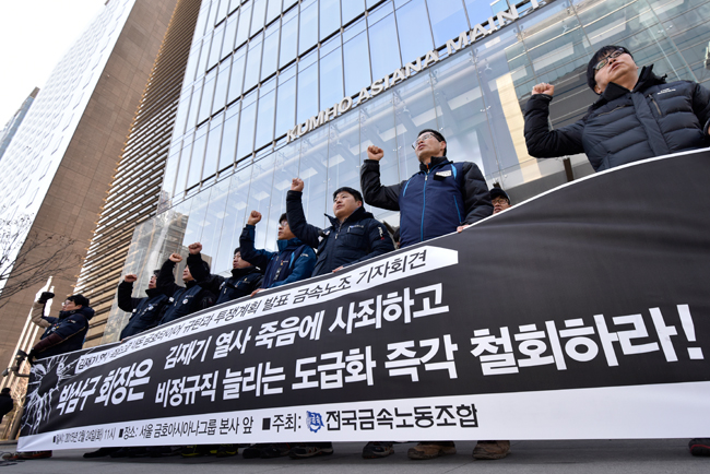 노조가 금호타이어 자본에게 김재기 열사의 뜻에 따라 즉각 도급화를 철회하라고 요구했다. 노조는 2월24일 서울 광화문 금호아시아나 본사 앞에서 ...