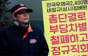 똑같은 집배원 업무를 하는데도 정규집배원(공무원)은 월 13만원의 정액급식비가 지급되지만 상시집배원에겐 밥값이 없다.