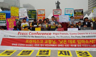 프란치스코 교황 방한을 앞두고 광화문에서 농성 중인 세월호 유족, 비정규직 노동자와 장애인들이 교황에게 광화문에서 농성하는 약자들의 힘이 돼달라...