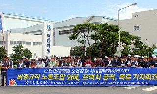 현대제철 순천공장 사내하청 업체 관리자가 금속노조 광주전남지부 현대제철비정규직지회(지회장 구희수, 아래 지회)의 대의원을 각종 향응으로 매수해 ...