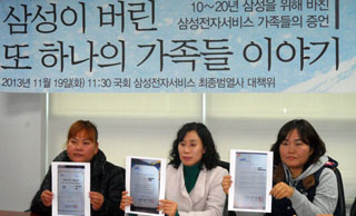 19일 오전, 국회의원회관에서 열린 ‘삼성이 버린 또 하나의 가족들의 이야기’ 증언대회에 참석한 정은숙(43), 김은영(36), 이현아(41) ...
