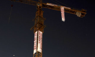 동화주택 공사현장 50m크레인에 오른 이는 민주노총 건설노조 대구경북건설지부 권오준 수석부지부장, 박경태 금호지구장, 배진호 조직부장이다. 10...