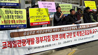 민주노총 공공운수노조․연맹 전국철도노조가 22일 오전 고용노동부 앞에서 기자회견을 열고 공기업 코레일의 자회사인 코레일관광개발이 정부의 공공부문...