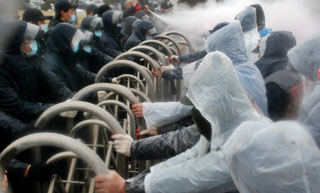 민주노총이 2일 오후 2시, 부산 한진중공업 영도조선소 앞에서 집중 결의대회를 열고 회사와 정권에 사태해결을 촉구했다. 이 과정에서 경찰과 집회...