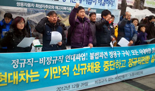 현대자동차 정규직노조(지부)가 ‘불법파견 정규직화 교섭 중단’을 선언했다. 정규직지부는 27일 오후 지부장 긴급 성명서를 내 '오늘 3시 이후 ...