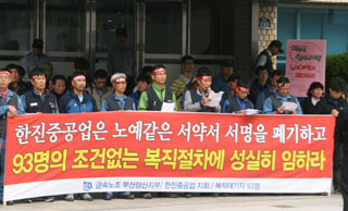 한진중공업(주)이 정리해고자 94명의 복직을 앞두고, 전환배치와 신체검사에 따른 불이익 등을 담은 근로계약서, 서약서를 강요하고 있는 것으로 드...
