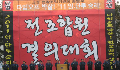 현대차지부는 3일 오전 6시 현대차 울산공장 본관 앞에서 '11 임단투 승리 전조합원 결의대회'를 열어 "타임오프 분쇄, 복수노조 창구 단일화 ...