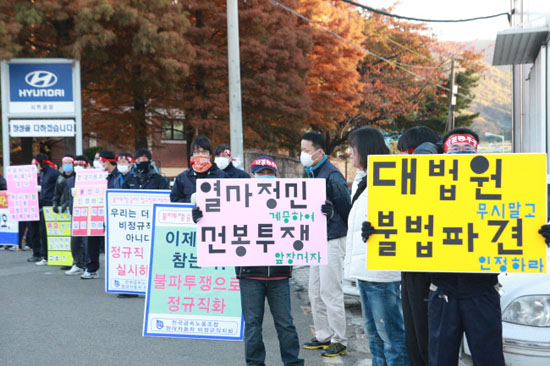 "현대차는 대법원 판결에 대해 '고법으로 파기 환송된 것이기에 아직 법적 판단이 끝난 것은 아니'라는 입장만을 앵무새처럼 반복하며 금속노조와 현...