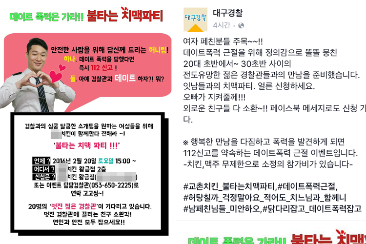 대구 남부경찰서(서장 서상훈)가 데이트폭력을 예방하겠다며 남성 경찰과 일반 여성의 미팅 행사를 진행해 논란이 일고 있다.