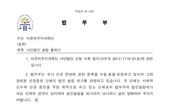법무부가 소수자 인권은 자신들의 업무 대상이 아니라며, 성소수자 인권 증진을 위해 결성된 비온뒤무지개재단(아래 무지개재단)의 설립을 허가하지 않...