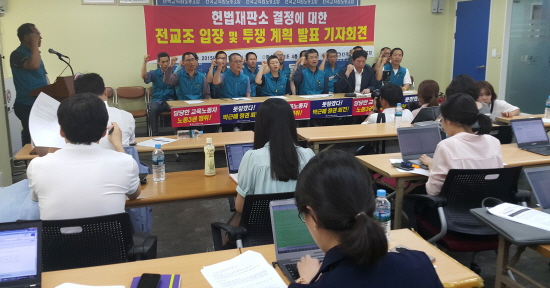 전교조는 교원의 단결권을 제대로 보장하지 않는 헌법재판소의 교원노조법 2조 ‘합헌’ 결정이 정부의 전교조 탄압 연장선상에 있음을 지적하며 교원노...