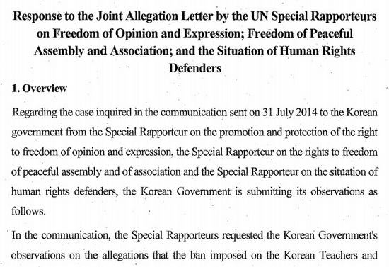 "전교조 설립 취소가 국제기준에 맞느냐"는 UN(국제연합) 특별보고관들의 합동 서면질문을 받은 한국 정부가 답신은 보냈지만, 이에 대한 답변은 ...