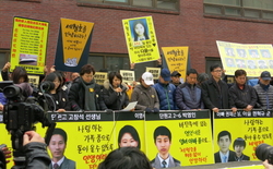 세월호 참사 1주기를 앞두고 열린 유가족과 대학생들의 간담회가 대학 측의 장소 대여 불허로 인해 교문 밖에서 진행되어야만 했다.