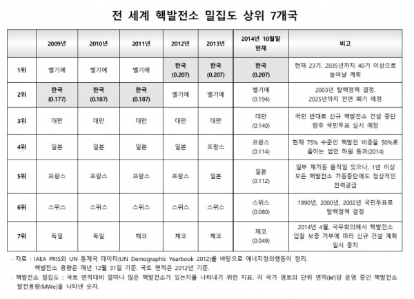 핵발전소 밀집도 상위권 국가들이 대부분 핵정책을 폐기하거나 축소하고 있는 반면 한국은 핵발전소를 계속 늘리고 있다.