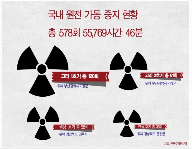 국내 가동 원전 23기가 578회에 걸쳐 55,769시간 46분 동안 사고 및 고장으로 발전 정지된 것으로 드러났다.