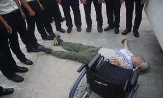프란치스코 교황의 장애인수용시설 '꽃동네' 방문을 반대하며 명동성당에서 단식농성을 시도하려던 전국장애인차별철폐연대(아래 전장연) 박경석 상임공동...