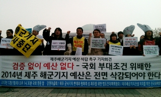 강정마을 주민, “제주해군기지 예산, 한 푼도 안된다”