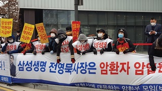 삼성생명(사장 전영묵) 주주총회 장소인 서울 서초구 서초동 삼성금융캠퍼스 앞. 삼성으로 인해 피해를 입은 해고노동자와 과천 철거민, 삼성생명 보...