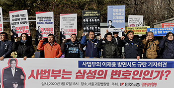 이재용 삼성전자 부회장의 국정농단 파기환송심 4차 공판이 17일 서울고등법원에서 열린 가운데, 민주노총이 법원과 삼성의 ‘이재용 방면 시도’를 ...