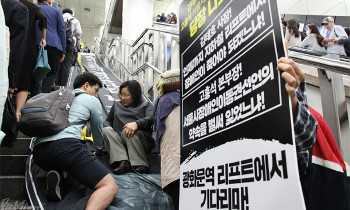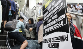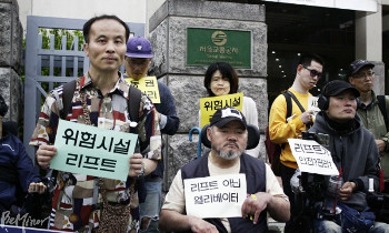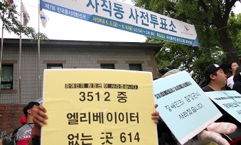 사직동주민센터 사전투표소 찾아간 장애인들, 엘리베이터 없는 2층 투표소에 ‘좌절’