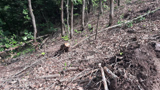 악산이라 소문난 주산에 올랐다. 잘려나간 나무뿌리 주변에 능선부를 깎아 생긴 토석류가 널려 있다.
