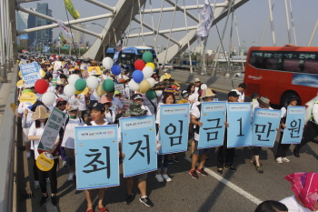 최저임금 1만 원 실현을 위한 걷기대회 ‘만원:런’에 1천 명의 시민이 참여했다.‘만원:런’은 17일 오후 3시 홍대입구역 경의선 숲길공원을 출...