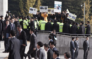 10여 미터 길이의 현관 입구 레드카펫 양 옆엔 세월호 유가족 50여명이 피켓을 들고 경찰과 경호원들에게 겹겹이 둘러싸여 대통령을 기다리고 있었...