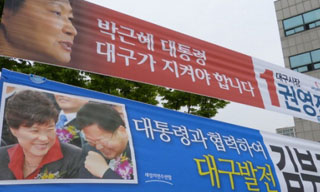 김부겸-권영진 ‘박근혜 활용한 현수막’, 송영우-이원준 “정책 대신 친박선거”