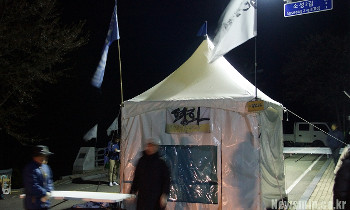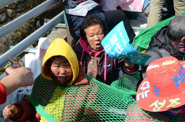 12일 사드(THAAD·고고도미사일방어체계)기지에서 1.2km 떨어진 경북 성주군 초전면 소성리 진밭교 앞에서 공사 장비 반입 중단을 요구하는 ...