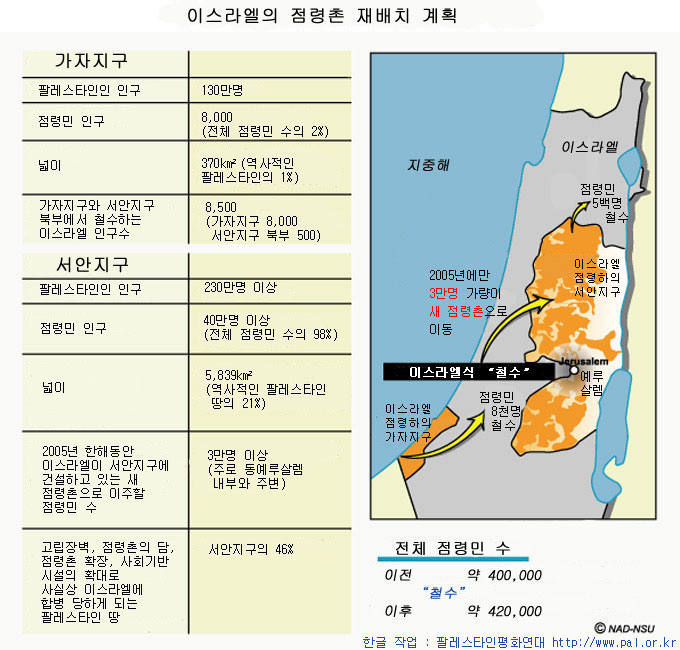 2005년 8월, 이스라엘은 점령지에서 점령촌을 철수한다고 '선전'하고 있습니다. 하지만 이스라엘의 목표는 가자지구와 서안지구에서 일부 점령촌을...