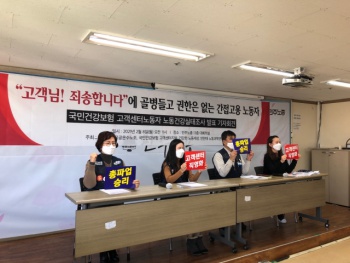 8일 오전 공공운수노조는 ‘국민건강보험 고객센터노동자 노동건강실태조사 결과 발표 기자회견’을 열고 많은 상담사들이 정밀 진단이 필요할 정도의 우...