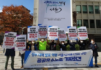 돌봄노동자들이 서울시와 서울시의회가 사회서비스원 종사자 처우 개선 관련 정부 대책을 역행하고 있다며 이를 규탄했다. 공공운수노조는 “같은 여당임...