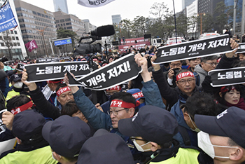 검찰은 21일 오후 서울남부지방법원에서 열린 민주노총 특수공무집행방해 치상죄 혐의 결심 공판에서 △민주노총 김억 조직쟁의실장에 징역 4년 △한상...