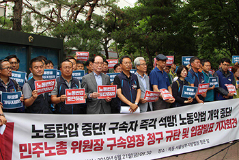 김명환 위원장은 이날 서울남부지방법원 구속영장 실질심사에 출석하며 “민주노총 탄압에 대한 문재인 정부의 의지를 분명히 확인했다. 저임금, 장시간...