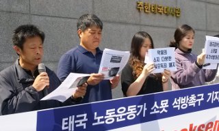 세계노동절에 구속 3년이 되는 태국 노동자의 석방을 위해 한국 노동자, 인권활동가들이 연대의 주먹을 치켜 올렸다.