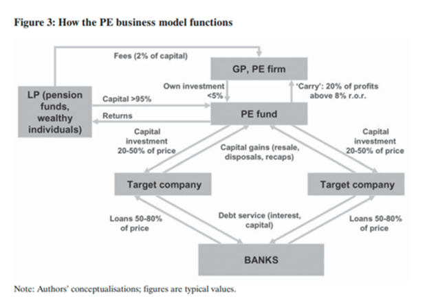결국 매입한 기업은 주식 시장에 상장(또는 재상장)되거나, 전략적 구매자(보통 같은 업계의 기업 또는 다른 사모펀드)가 인수한다. 이렇게 하면 기업을 3년가량 운영하며 배당금을 짜내는 것 외에도 자본 이익(capital gain)으로 판매할 수 있다. 이 과정에서 사모펀드는 기업에 컨설팅 및 관리 수수료를 추가로 부과하기도 한다. 결국 사모펀드 모델은 기업 노동력에서 잉여가치를 극대화하고, 이를 위해 더 많은 부채를 끌어오며, 배당 수익을 최대한 추출하는 동시에 생산적 투자 비용을 최소화하려고 한다.