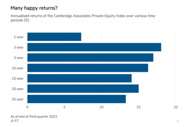 기관 투자자들은 주식 시장보다 사모펀드를 통해 더 나은 수익률을 기대한다. 캐나다의 데이터 수집 업체인 CEM 벤치마킹(CEM Benchmarking)은 약 15조 달러 규모의 연기금, 기부금, 기타 국부펀드가 보고한 데이터를 분석한 결과, 지난 10년 동안 사모펀드의 평균 연간 순수익률이 공모 주식(public equities)보다 4%포인트 더 높았다는 사실을 발견했다.