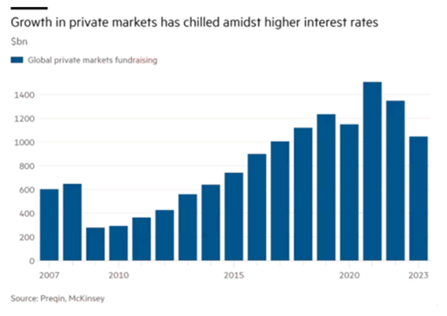 2007-2009년 금융위기 이후 사모시장은 폭발적인 성장을 경험했으며, 이는 주로 매우 낮은 금리를 이용해 매입한 기업들에 막대한 부채를 떠안긴 결과였다. 2008-2009년 금융위기에 대응해 전 세계 중앙은행들이 금리를 거의 0에 가깝게 낮추자, 사모펀드는 가장 길고 강력한 호황기에 돌입했다. PitchBook 데이터에 따르면, 2021년 시장이 절정에 달했을 때 사모펀드 거래 규모는 사상 최고인 1조 2천억 달러에 달했다.