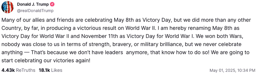 도널드 J. 트럼프의 2025년 5월 1일 Truth Social. 우리의 많은 동맹국과 친구들이 5월 8일을 승전기념일(Victory Day)로 기념하고 있지만우리는 2차 세계대전에서 압도적으로 가장 큰 승리를 만들어낸 나라다나는 지금부터 5월 8일을 2차 세계대전의 승전기념일로, 11월 11일을 1차 세계대전의 승전기념일로 다시 명명하겠다우리는 두 차례의 전쟁에서 모두 승리했다힘과 용기군사적 탁월함 면에서 우리와 견줄 나라는 없었다그런데 우리는 아무것도 기념하지 않는다 — 그 이유는 더 이상 기념할 줄 아는 리더들이 없기 때문이다이제 우리는 다시 승리를 기념하기 시작할 것이다!”