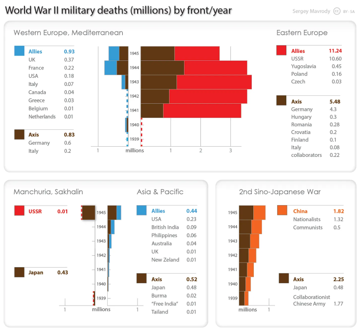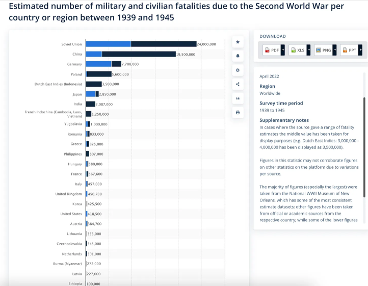 트럼프의 과장된 발언을 사실로 확인해 보기 위해, 2차 세계대전 당시 군인과 민간인의 사상자 수를 간단히 다시 떠올려 보자아래 그래프를 보면 파란색은 군인검은색은 민간인을 나타낸다미국은 전체 사상자 수 기준으로 18위를 기록했고그 대부분이 군인이다.