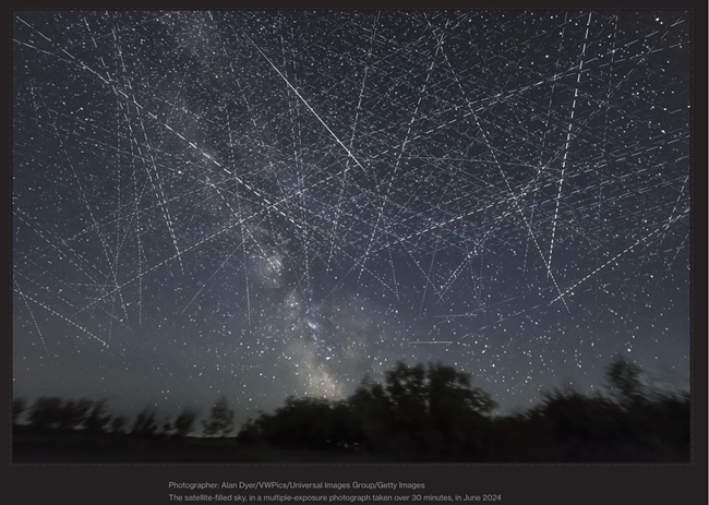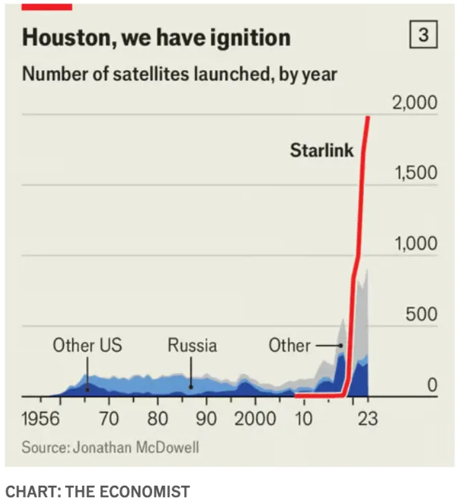 아래에서 확인할 수 있는 그래프는 1957년 10월 4일 스푸트니크가 궤도에 오른 이후 위성 발사 수를 보여준다. 낮고 평평한 파란색과 회색 선은 소비에트연방, 미국, 유럽연합이 합쳐서 쏘아올린 위성들이다. 수직의 빨간 선은 2019년 5월 첫 60개의 스타링크(Starlink) 위성이 궤도에 오른 이후 머스크의 스페이스X가 발사한 위성들을 나타낸다.