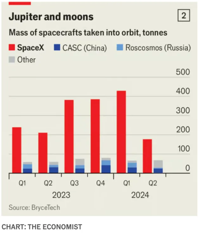 2024년 상반기에 스페이스X는 중국과 러시아 연방우주공사(로스코스모스, Roscosmos)를 포함한 전 세계의 모든 우주 발사량을 합친 것보다 7배나 더 많은 중량을 우주로 발사했다.