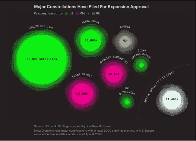 미국 연방통신위원회(FCC)는 스페이스X가 12,000개의 스타링크 위성을 발사하는 것을 허가했으며, 이 회사는 국제 규제 기관에 추가로 최대 30,000개의 우주선을 쏘아올리기 위한 서류를 제출했다. 이것이 얼마나 엄청난 규모인지를 이해하기 위해 덧붙이자면, 2022년 11월 7일 기준으로 유럽우주국(ESA)에 따르면 인류 역사상 지금까지 발사된 위성은 총 14,450개에 불과하며, 이 중 현재 활동 중인 것은 6,800개에 지나지 않는다.