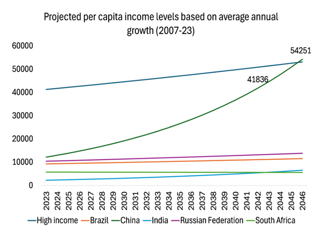 마지막으로 왜 중국만은 예외적으로 격차를 좁히고 있는 것처럼 보이는지를 간단히 다루었다. 내가 추정한 장기 1인당 소득 성장 추세에 따르면, 브릭스 등 글로벌 사우스의 주요 국가 중 향후 20년 내 고소득국가 수준에 도달할 수 있는 나라는 중국뿐이다. 2023년 고소득국의 평균 실질 1인당 소득은 41,278달러였고, 중국은 2041년에 이 수준에 도달하며 2046년에는 고소득국의 예측 수준을 따라잡을 것으로 나타났다.